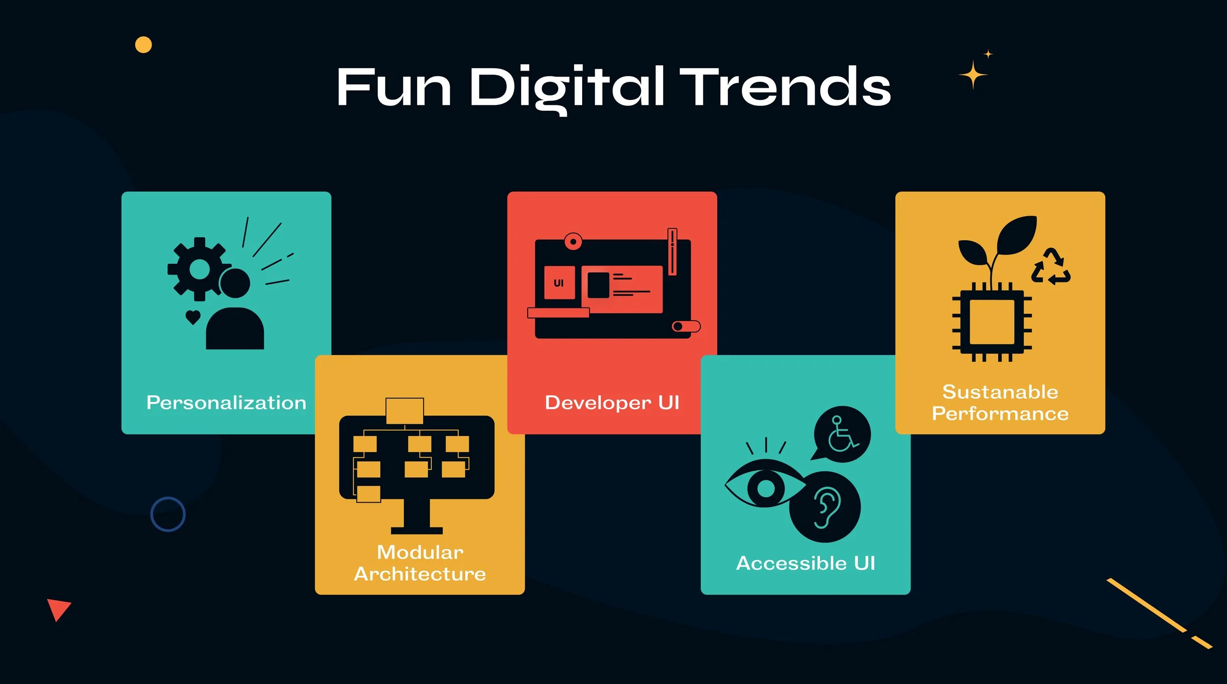 Digital expectations are accelerating, pushing brands to shift from feature‑led products to fluid, anticipatory, and trust‑driven experiences across all channels.Hyper‑personalization is evolving from one‑off tactics to real‑time, end‑to‑end adaptive journeys, powered by interoperable data and AI with explainability built in.Wearable‑first spatial interactions (AR/XR) are emerging as a mainstream interface paradigm, enabling persistent, multimodal, hands‑free digital experiences.Modular, composable architecture is becoming the enterprise default, enabling faster releases, cleaner governance, and independent evolution of key services.Accessibility and sustainability are now non‑negotiables, with global regulations and performance expectations shaping digital design standards.Visual design is diverging between bold minimalism and expressive maximalism—both valid when anchored in clarity, accessibility, and performance.